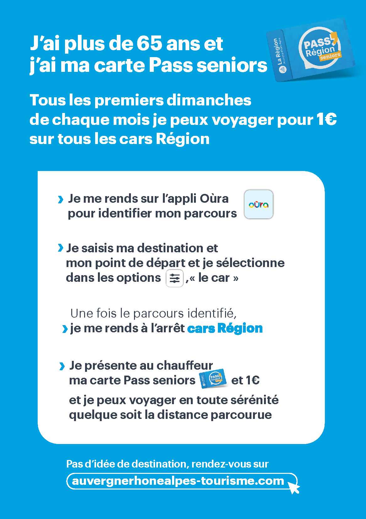 À partir du 1er février, tous les cars Région (hors lignes touristiques) accepteront la carte Pass Senior, disponible gratuitement auprès de la Région Auvergne-Rhône-Alpes. Destinée aux personnes de plus de 65 ans, cette carte propose des réductions chez de nombreux partenaires et permettra également de voyager à bord des cars Région pour 1 euro le trajet, chaque premier dimanche du mois. Une opportunité de se déplacer à moindre coût, quelle que soit la distance parcourue.